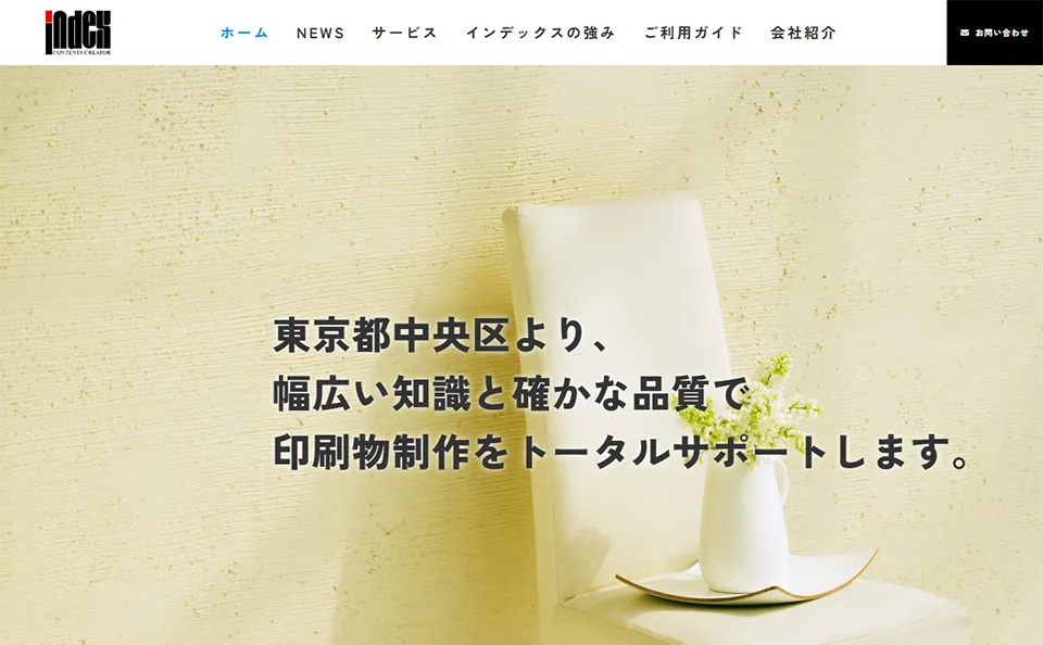 東京都中央区の印刷会社、株式会社インデックスです。当社は、印刷物等をデザインから納品までトータルにサポートいたします。長年積み上げてきた実績から生まれる幅広い知識と確かな品質をベースに、お客様の印刷物制作に関する課題に取り組んでまいります。