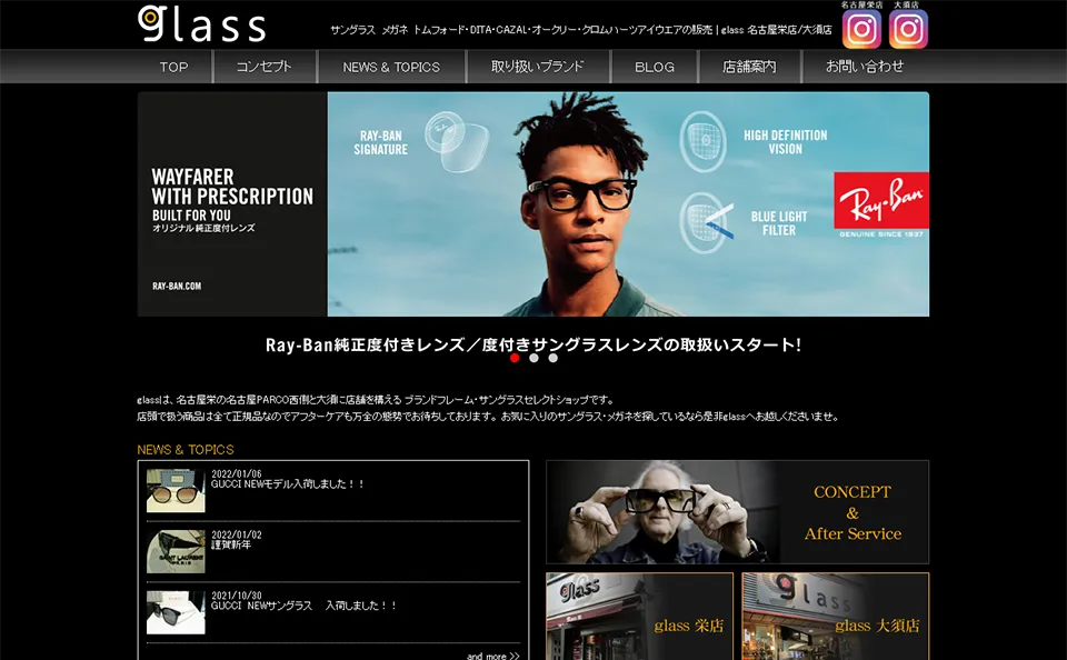 glassは、名古屋栄の名古屋PARCO西側と大須に店舗を構えるブランドフレーム・サングラスセレクトショップです。店頭で扱う商品は全て正規品なのでアフターケアも万全の態勢でお待ちしております。 お気に入りのサングラス・メガネを探しているなら是非glas... -