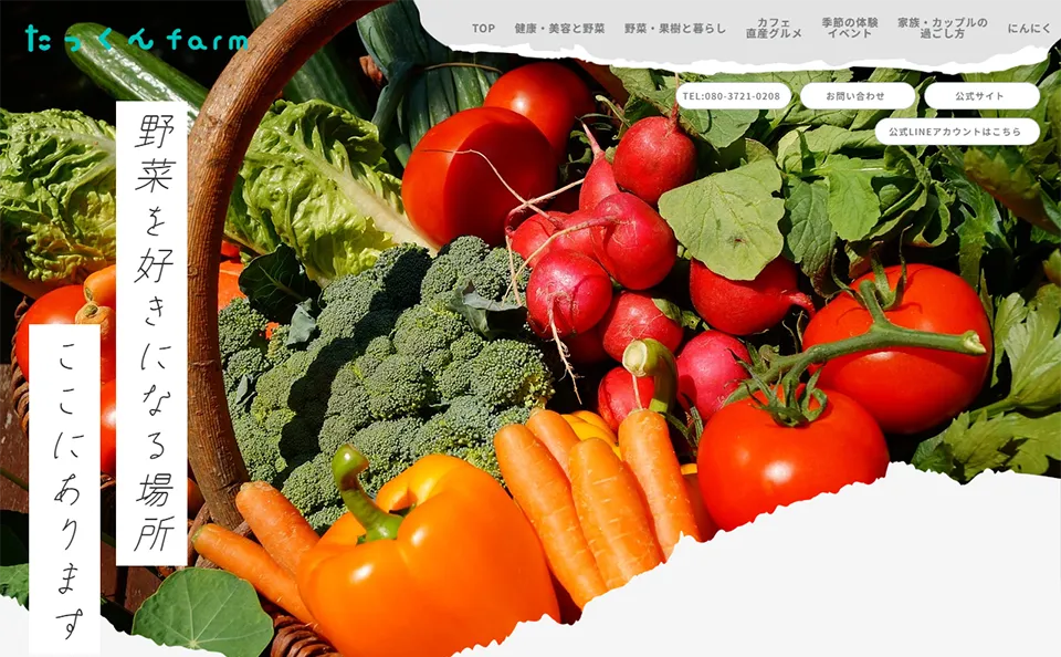 たっくんfarmでは、減農薬栽培による多品種の野菜生産を中心に、農業を体験し楽しめる様々なイベントを提供しています。季節の野菜を自分の手で収穫できる収穫体験をはじめ、採れたて野菜を使ったBBQ体験、手作りピザ体験など、ご家族やお友達と楽しめるプ... -