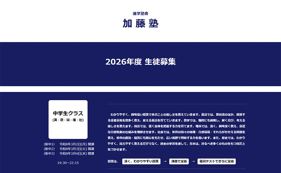 静岡県浜松市中央区の加藤塾です。わかりやすく、興味深い授業で学ぶことの楽しさを教えていきます。授業は、すべて塾長が直接指導します。 店舗/企業名 加藤塾 所在地 〒433-8124静岡県浜松市中央区泉1丁目2-14 TEL 053-474-0376 UR... -