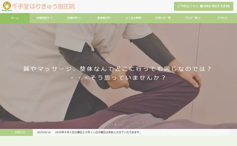 東京八王子の千手堂はりきゅう指圧院は、患者様の症状の回復、その後も病気にならず、健やかに人生を送っていただくためのサポートをさせていただきます。 店舗/企業名 千手堂はりきゅう指圧院 所在地 〒192-0063東京都八王子市元横... -